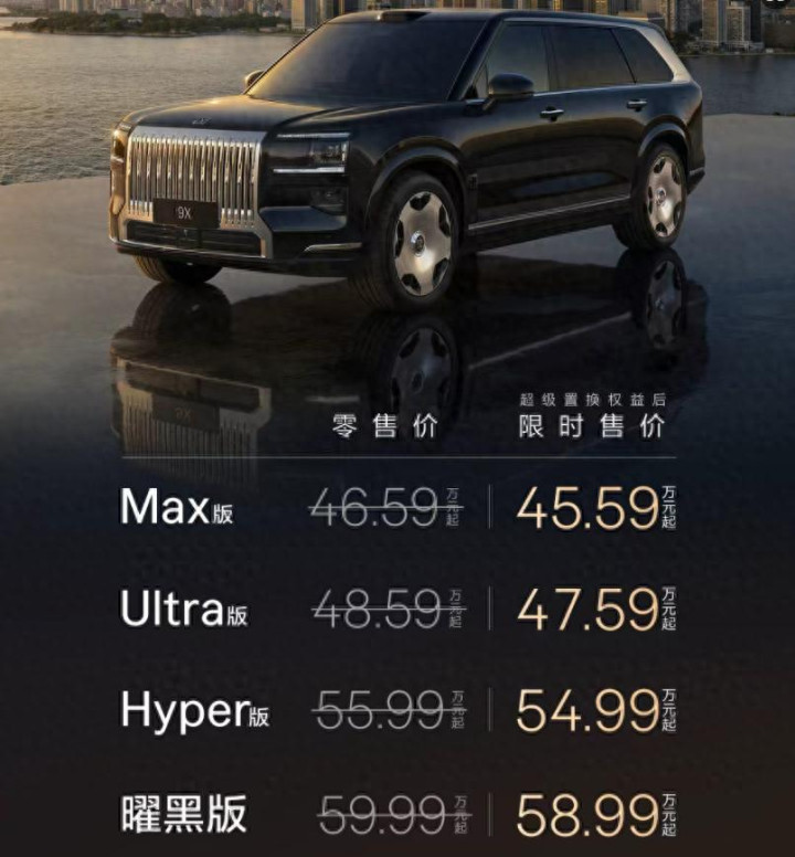 9月29日,极氪品牌旗下全球首款900V高压混动超豪华SUV——9X正式上市,新车共推出Max版、Ultra版、Hyper版及曜黑版四款配置,限时售价46.59-59.99万元 。